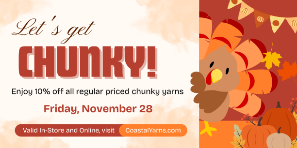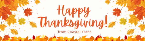 Happy Thanksgiving from Coastal Yarns! We hope you're enjoying some time off, wonderful company, and amazing food! We will be closed Wednesday and Thursday for Thanksgiving. Join us for Black Friday, Small Business Saturday and specials all weekend! |