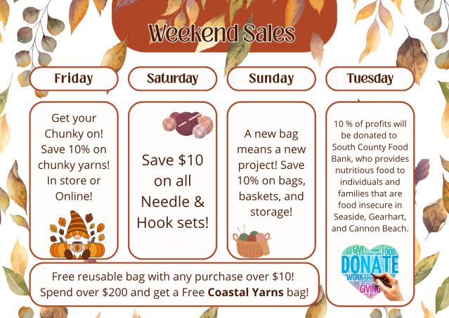 It's not just chunky yarns that are geting all the fun this weekend! We've got special deals happening all weekend long! Be sure to check our Facebook or Instagram for more! |